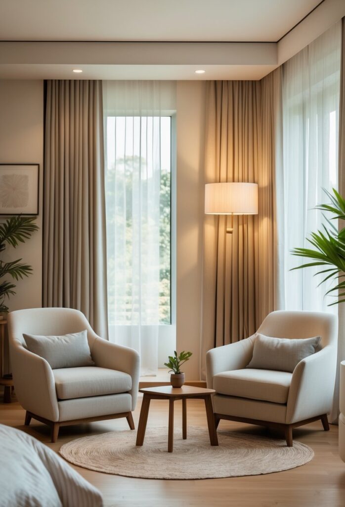 Couples can benefit from having separate seating spots in the bedroom. Opposing chairs or small sofas placed facing each other create personal spaces while still allowing connection.