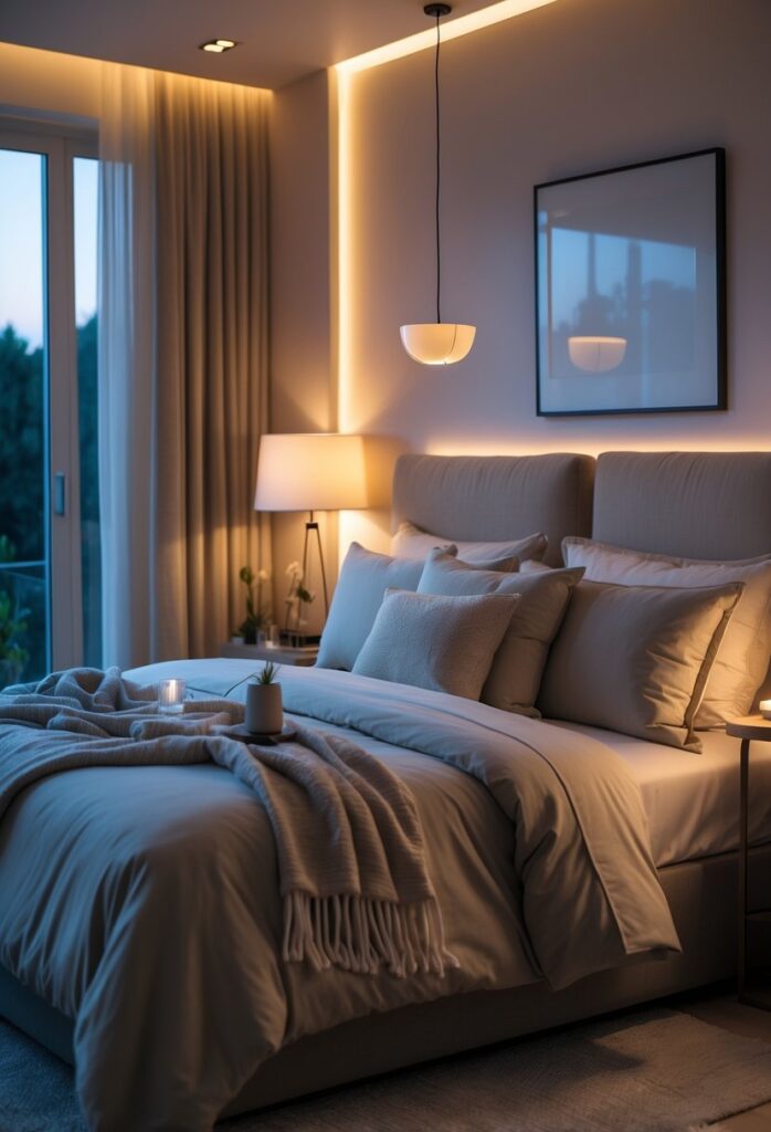 Soft, ambient lighting creates a calm and inviting atmosphere in a couple’s bedroom. It helps set a relaxed mood for conversation or winding down after a long day.