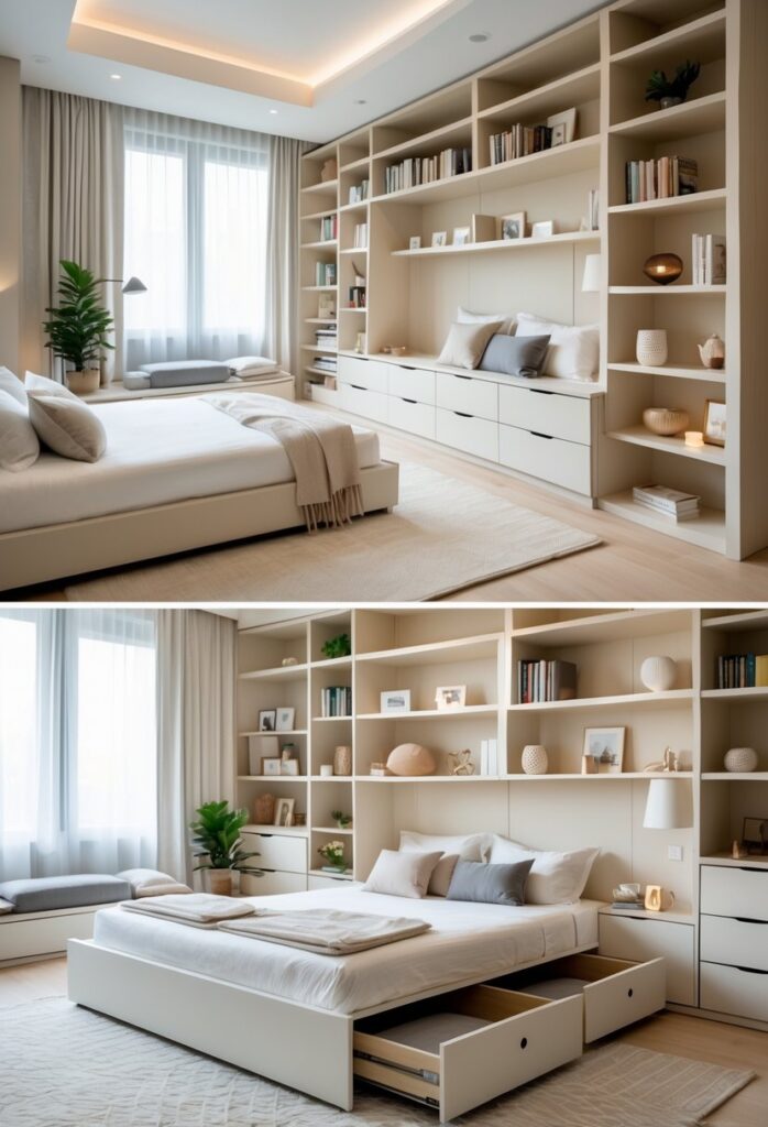 Built-in shelves add storage without cluttering the floor. Shelves around the bed or on walls can hold books, decor, or personal items. This setup keeps things within reach and frees up other areas.