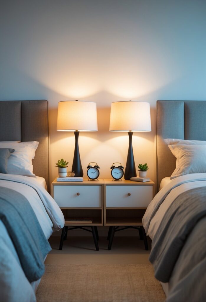 This setup supports different styles. One side may have a modern lamp, the other a vintage one.