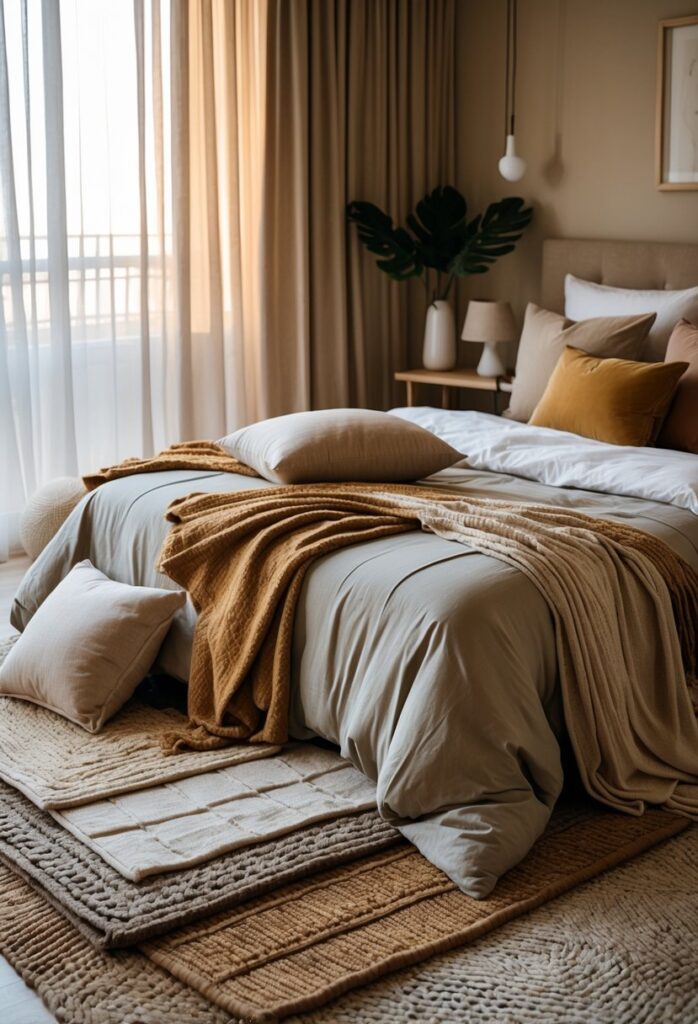 Layering different textures adds depth and warmth to a bedroom. Rugs with various materials create a cozy base and make the space feel inviting.