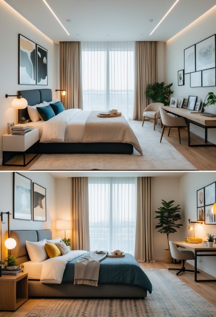 Using neutral base colors across the room creates harmony, while accents like pillows, artwork, or lamps reflect personal tastes. Communication about what each finds important is key—whether that’s a specific color, type of furniture, or lighting style. Practical solutions like separate storage spaces or dual bedside tables help keep personal areas defined without cluttering the room.