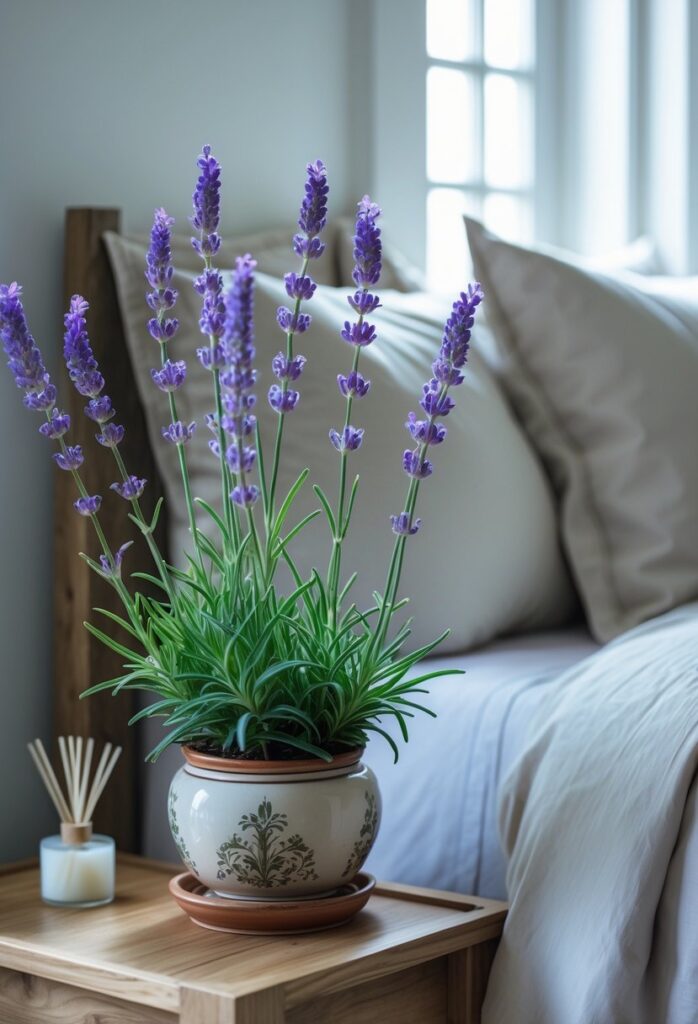 Placing a lavender plant near a window or bedside table can allow the fragrance to fill the room. It also needs moderate sunlight and regular watering to stay healthy.