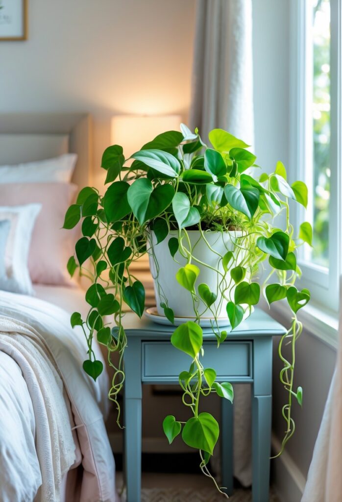 Pothos is a popular plant because it is simple to grow and needs little care. It thrives in low light, which makes it perfect for most bedrooms.