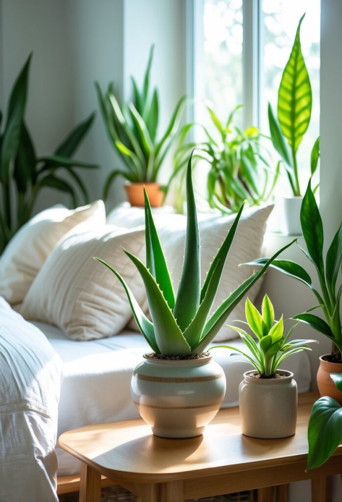 Aloe Vera is known for its ability to improve air quality. It releases oxygen at night, which helps keep the bedroom air fresh.