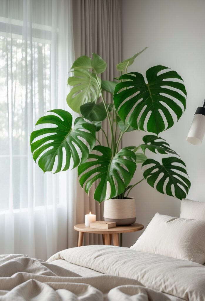 Overall, Monstera is a stylish, low-maintenance choice. It combines beauty and practicality for a soothing bedroom setting.