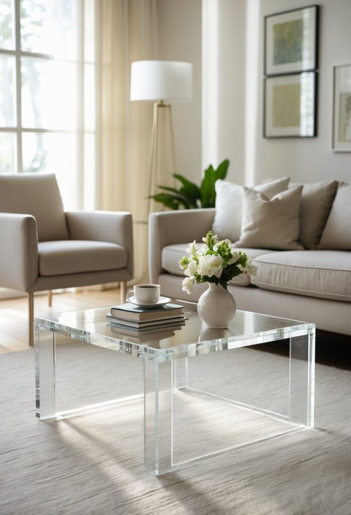 You’ll find this coffee table made of thick, half-inch clear acrylic. It offers a modern look without taking up visual space in your room.