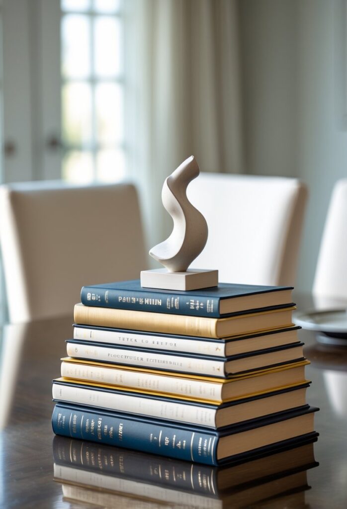 Stacking a few hardcover books creates height and interest on the dining table. It adds a simple, elegant base.