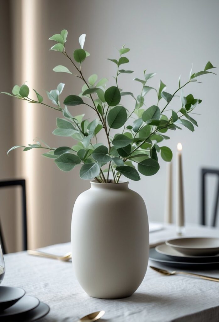 Choosing a white or neutral-colored vase helps highlight the greenery. This keeps the table calm and inviting.