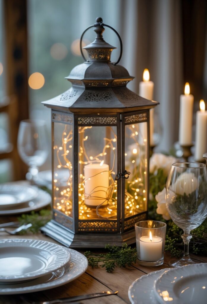 For more ideas on combining vintage lanterns with fairy lights, see lantern centerpiece ideas for dining tables.