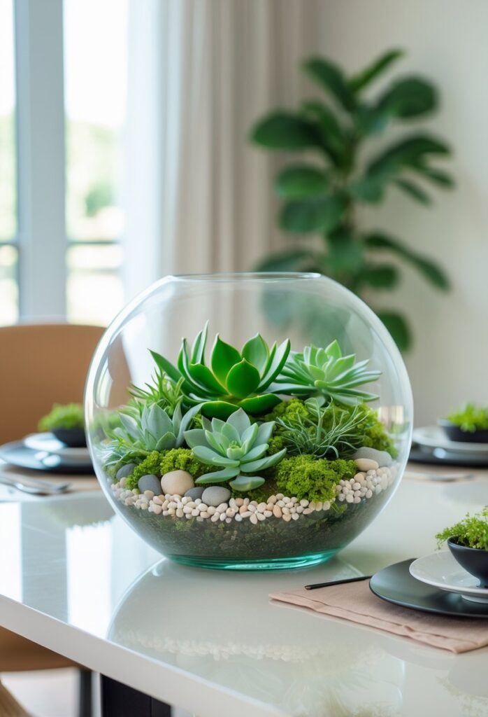 A succulent terrarium centerpiece adds a modern touch to any dining table. It uses glass containers to display small plants.