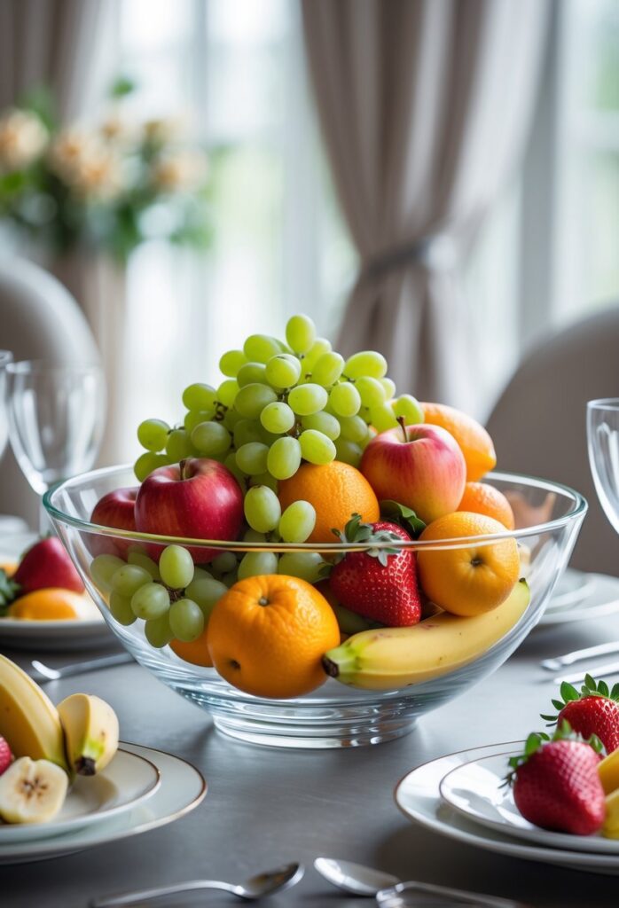 For more unique ideas on fruit centerpieces, one can look at creative designs involving glass bowls filled with fresh fruits. These arrangements balance natural beauty with functionality. See more about glass fruit centerpiece ideas.