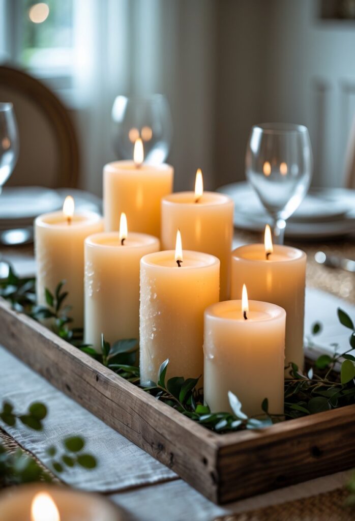 Using a wooden tray brings a rustic, natural feel. The tray can hold candles of different heights and sizes for visual interest.