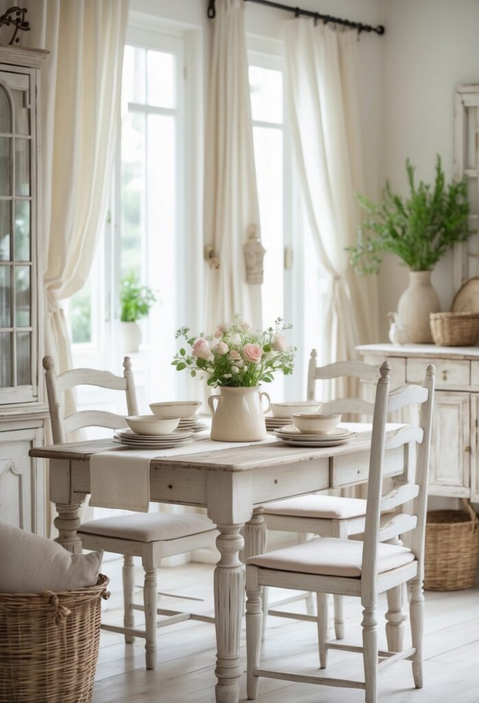 Windows often have light, airy curtains that allow natural light in while keeping the room bright. Accessories like antique picture frames, wicker baskets, or delicate ceramics complete the peaceful retreat.
