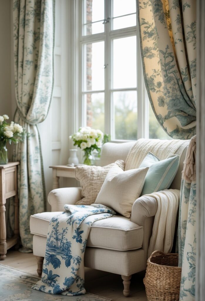 Textiles in this style are soft, comfortable, and simple but add plenty of charm. Linen, cotton, and burlap are popular choices because they feel natural and breathable. Curtains, cushions, and upholstery often feature classic patterns like checks, stripes, or floral prints.
