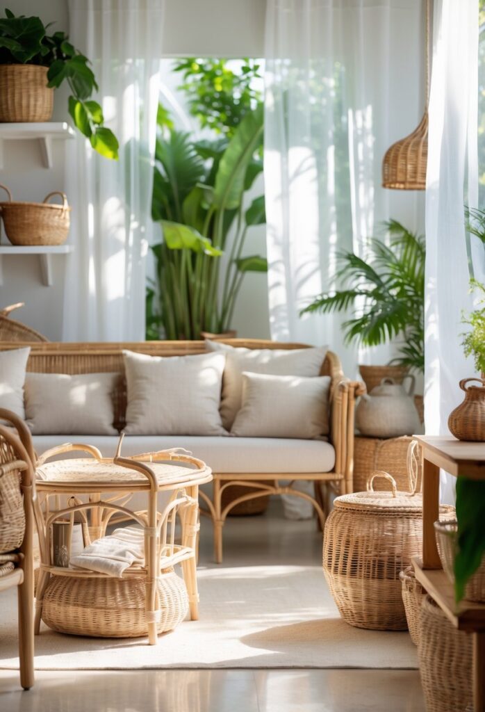 Using wicker and rattan helps create a relaxed, earthy atmosphere. These pieces also offer practical storage while enhancing style.
