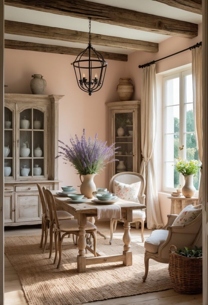 In the kitchen and dining areas, French country style balances rustic charm with practical elegance. Cabinets and shelves typically feature distressed or painted wood in pale tones like cream or soft gray.