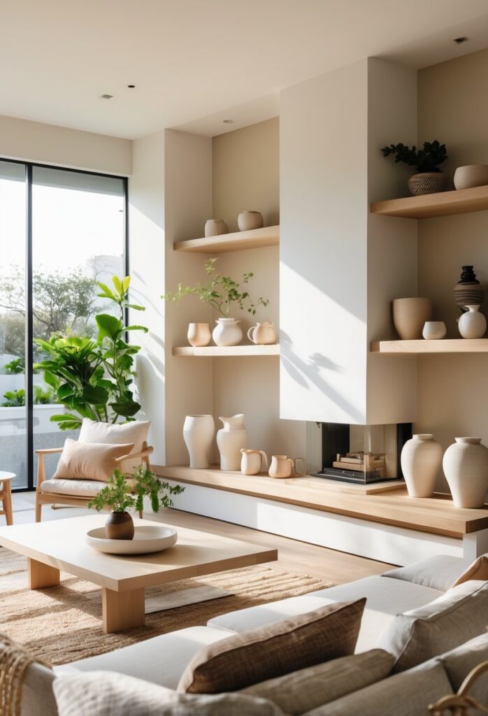 Choosing smooth, earthy pottery creates a soft contrast with the room’s clean lines. Curated ceramics on shelves or tables add texture without clutter.