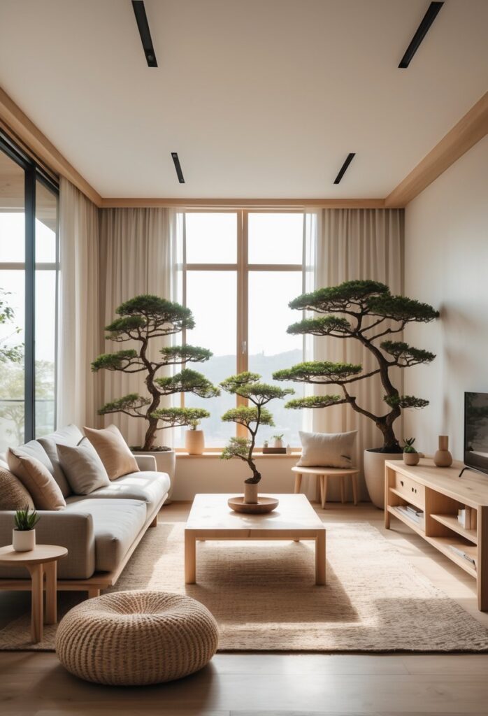 Adding plants like bonsai or snake plants brings nature into the living room. These choices fit well with Japandi’s focus on calm and simplicity.
