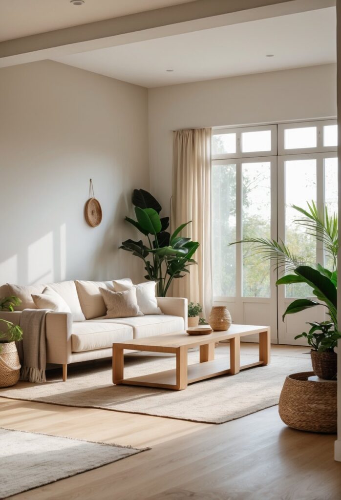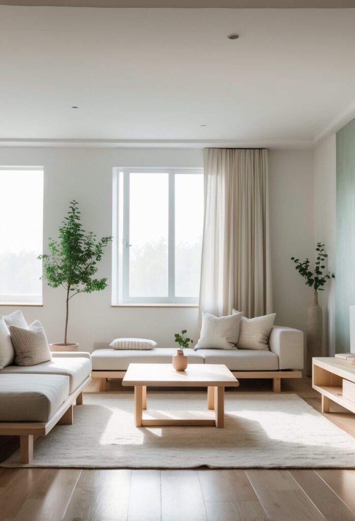 This color scheme helps highlight natural materials like wood and stone. It keeps the room feeling light, open, and inviting while staying true to Japandi style.