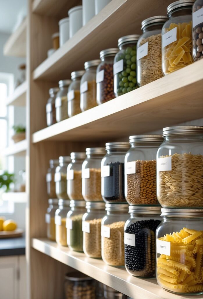 Using clear glass jars helps store pantry staples like rice, pasta, and flour neatly. It makes it easy to see what is inside without opening containers.