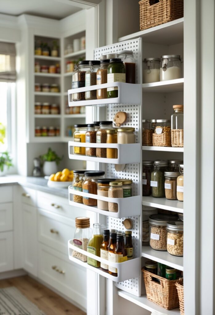 Using the door for storage helps reduce clutter. It makes the pantry look more organized without taking up floor space.