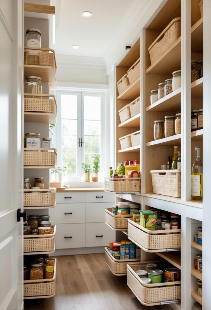 Using pull-out baskets can improve pantry order, especially in tight spaces. They allow better use of vertical space and reduce clutter by keeping items contained.