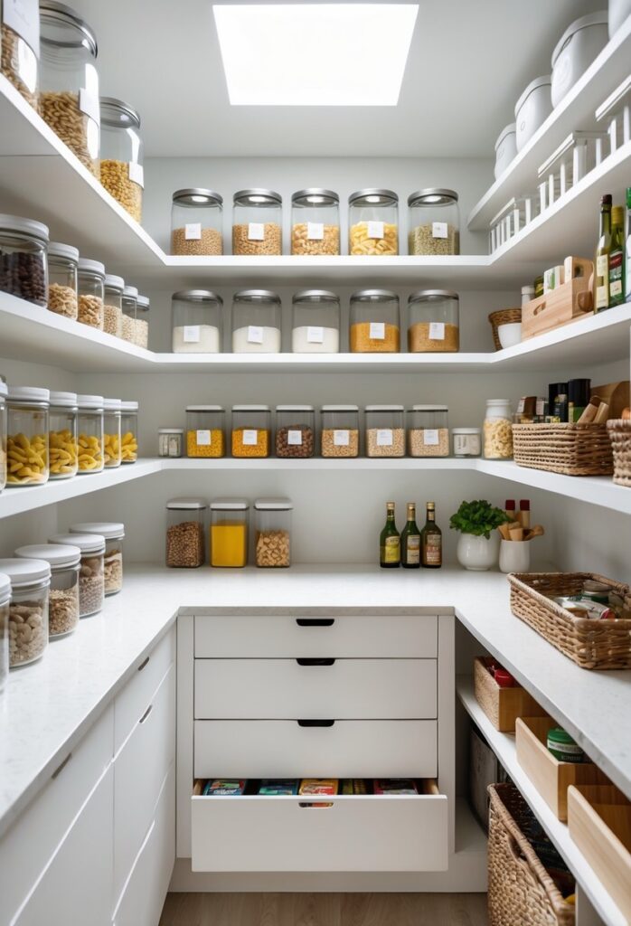 Glass jars keep food fresh longer and look uniform on shelves. This reduces clutter and makes the pantry more functional and attractive.