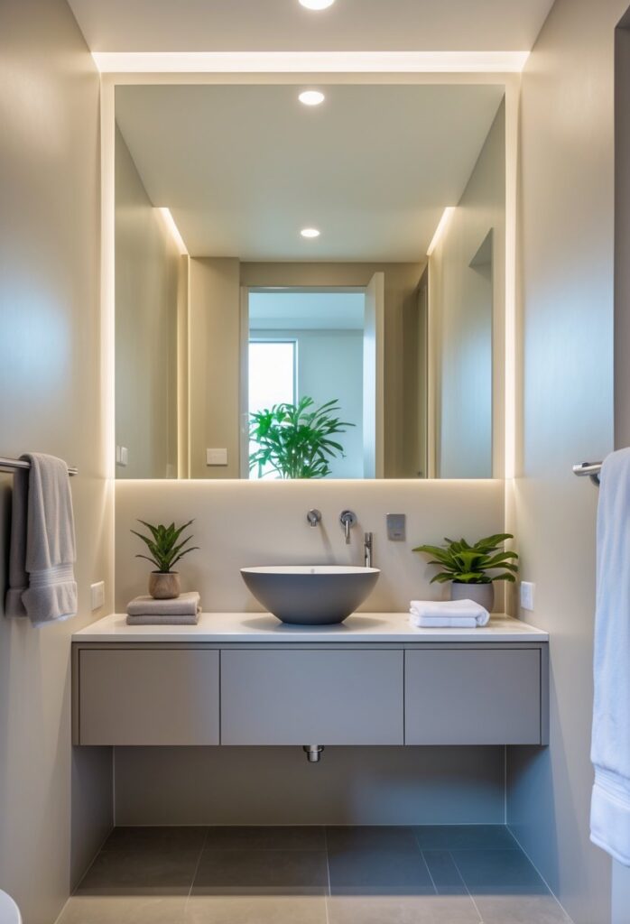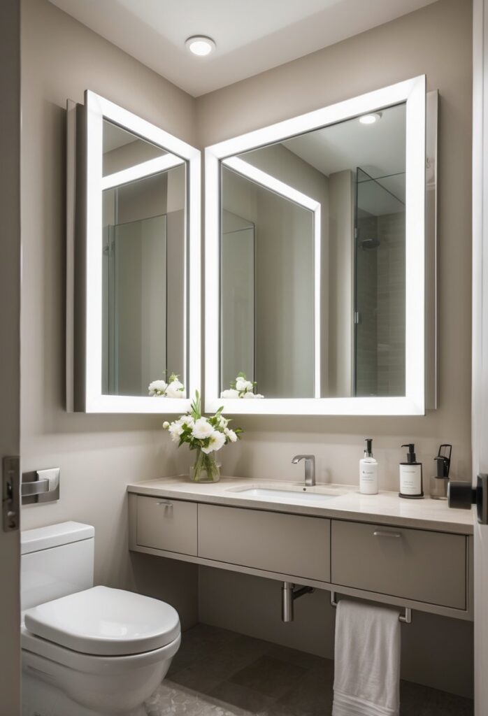 Storage solutions like recessed shelves or narrow cabinets keep essentials handy without cluttering counters. Mirrors also play a key role; large or well-placed mirrors reflect light and create an illusion of more room.