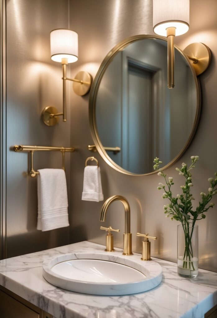Metallic finishes add a subtle shine that lifts the look of a powder room. Gold, brass, or copper fixtures work well to create a warm, elegant feel.