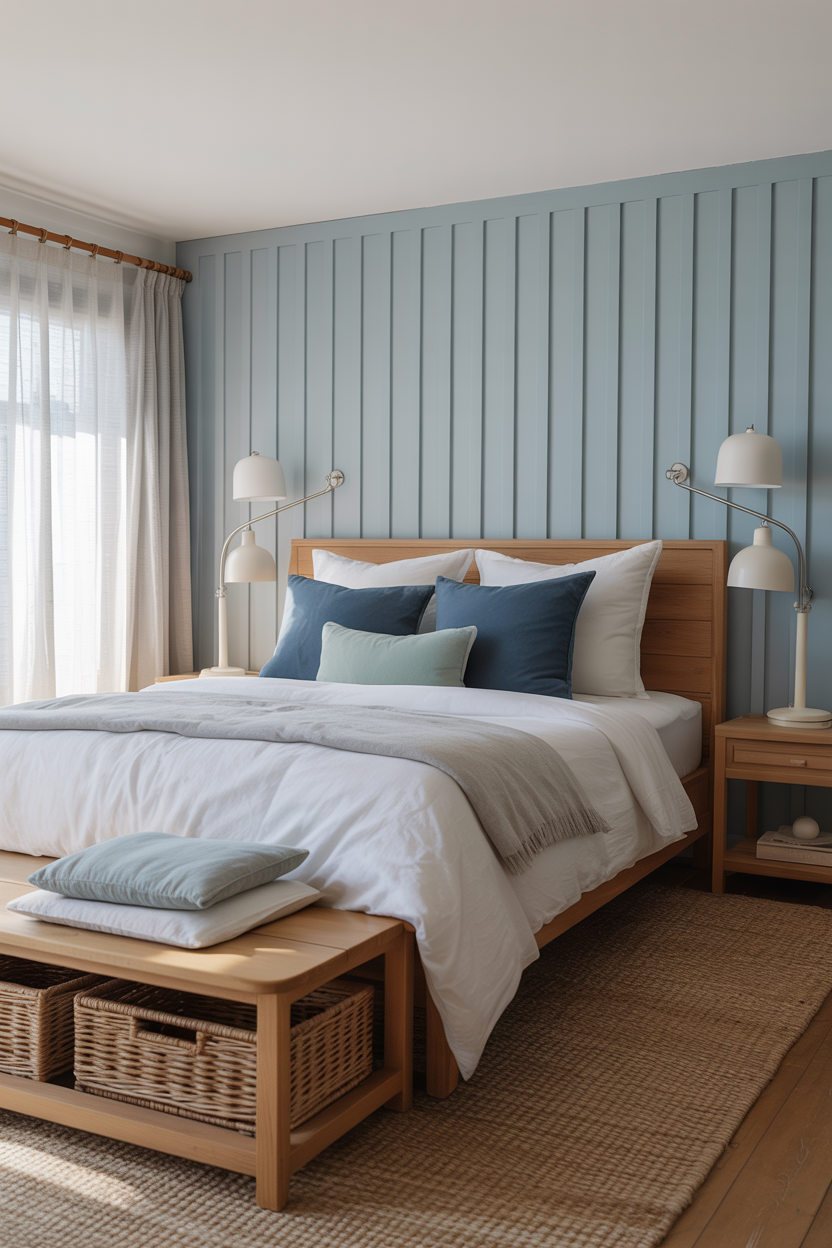 - Flooring: Light ash planks that run lengthwise to elongate the room.