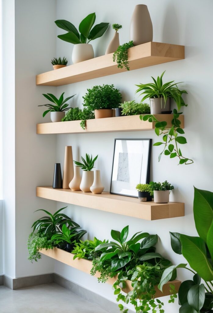 Floating shelves create extra space to display plants and small decor pieces. They fit well on neutral or brightly colored walls to add depth and interest.