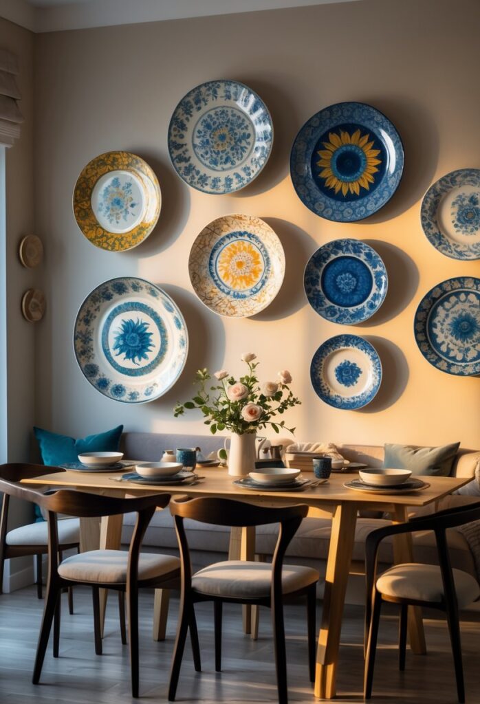 Decorative plates offer a simple way to add style to dining room walls. They create visual interest without needing expensive artwork.