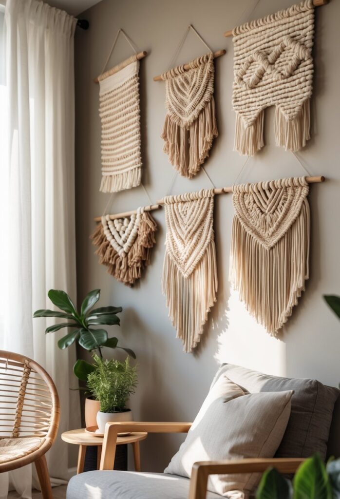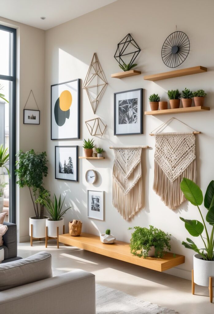 Adding woven art or fabric hangings adds texture. This approach keeps the wall dynamic and inviting.