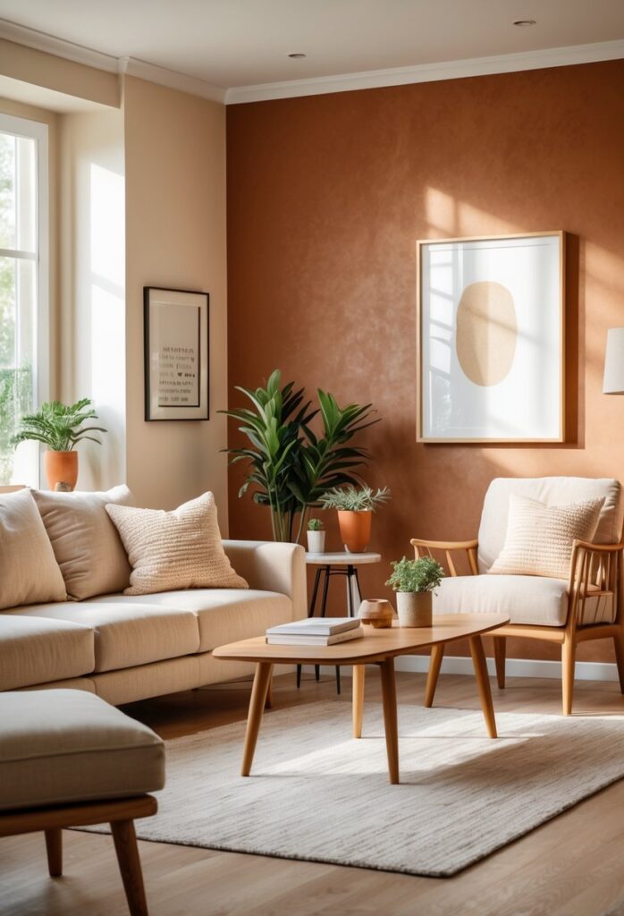 Terracotta paint paired with creamy white walls creates a warm and balanced look.