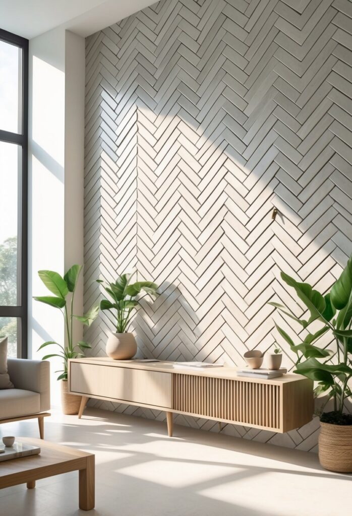 A herringbone tile accent wall uses tiles arranged in a zig-zag pattern. This design adds subtle texture and movement to any room.