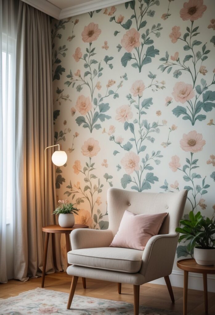 Vintage floral wallpaper adds timeless charm to an accent wall. It often features soft colors and detailed flower patterns that bring a classic feel.