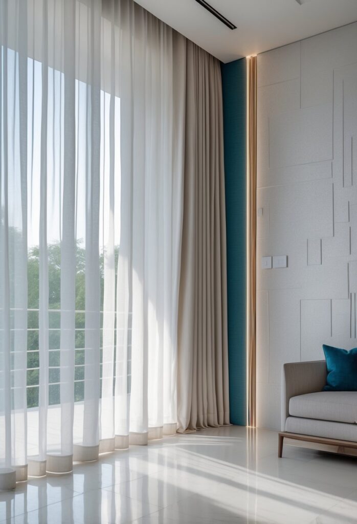 Sheer drapes create a soft, light-filtering accent wall. They add texture without heavy color or patterns.