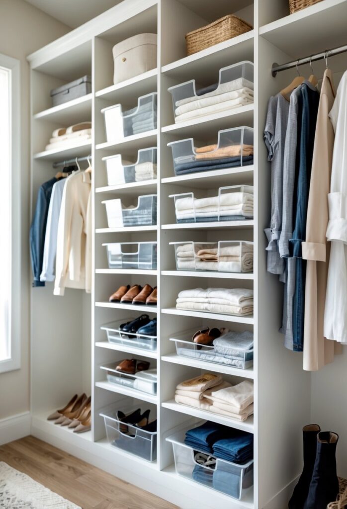 Using clear bins is especially helpful for small or crowded closets. It reduces clutter by keeping items contained and visible.
