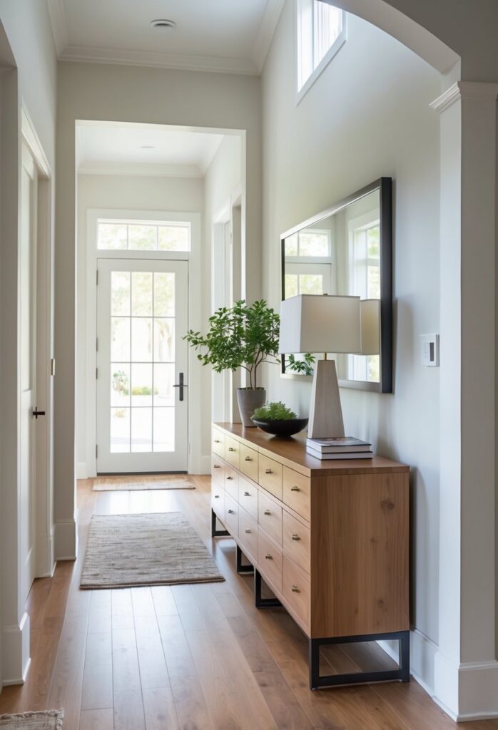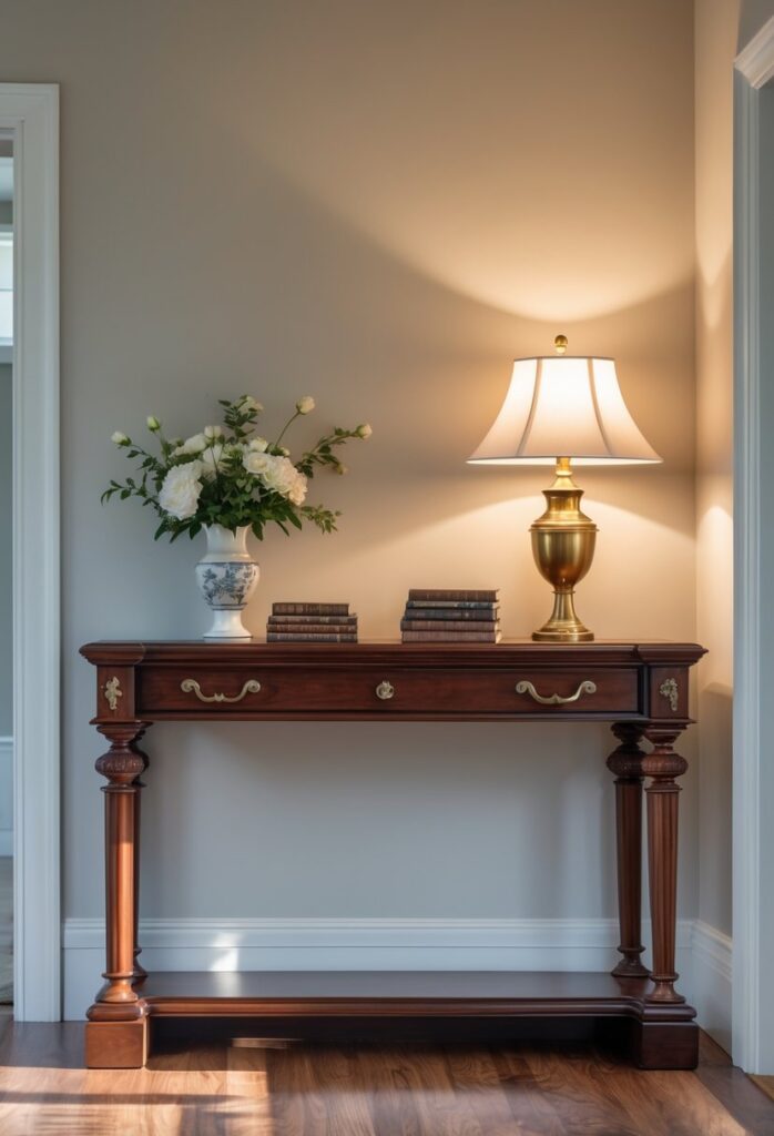 Using colored finishes or bold hues works best in more extensive entry spaces where the table can serve as a statement piece. For subtle coordination, matching the table color with door trim or wall accents helps unify the space visually while keeping the entryway inviting color and finish guide.