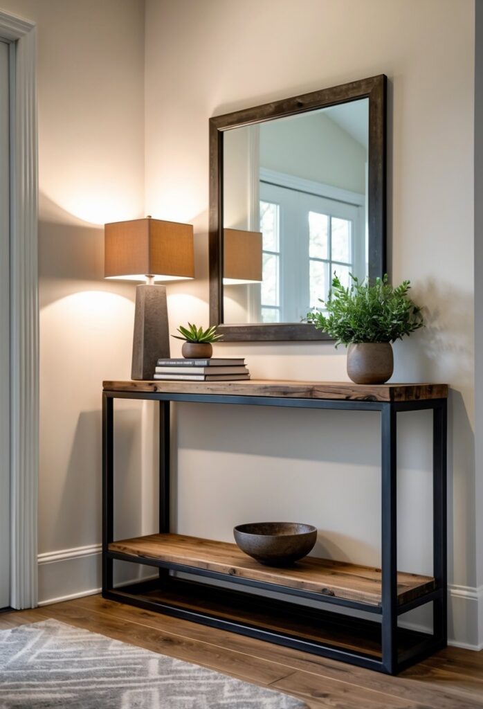 An industrial style console table combines metal and wood for a simple, rugged look. It fits well in entryways with a modern or rustic design.