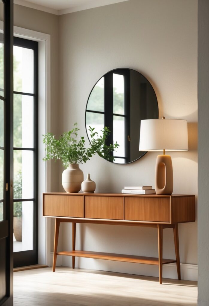 The Mid-Century Modern console table combines style with function. It fits well in entryways, living rooms, or hallways.