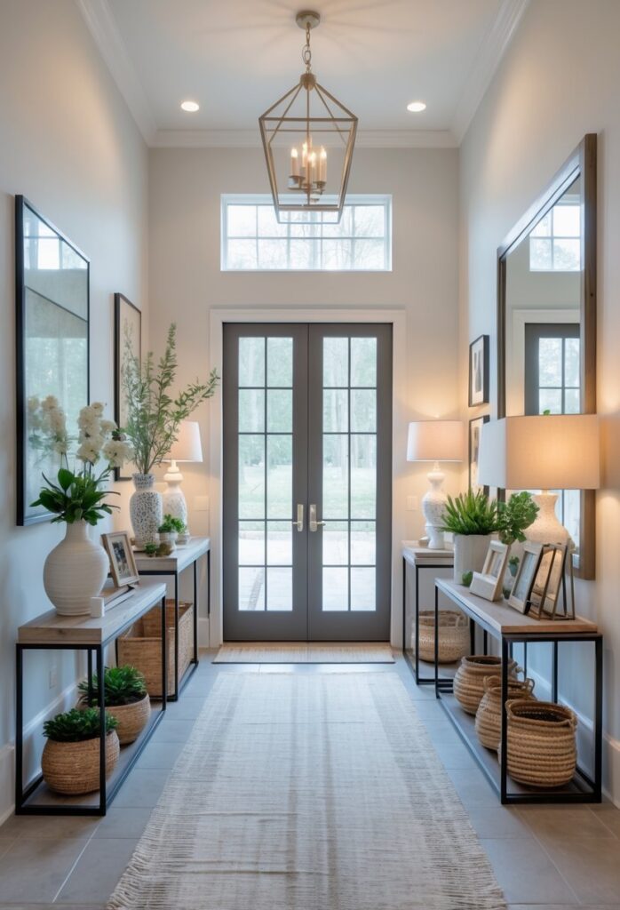 For modern or minimal styles, metal and glass tables make a sleek statement. Glass tops paired with metal bases keep the look light and open, which helps in smaller or darker entryways.
