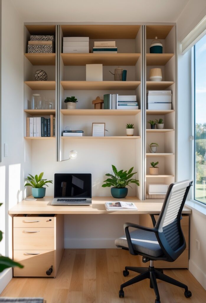 Built-in shelves help use wall space effectively, especially in smaller rooms. They keep items off the desk, creating a cleaner workspace.
