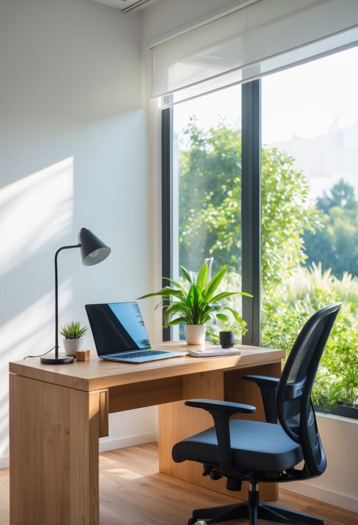 Good lighting reduces eye strain and boosts alertness. Natural light is best, so placing the desk near a window is ideal. If this isn’t possible, full-spectrum LED bulbs simulate daylight and minimize headaches.