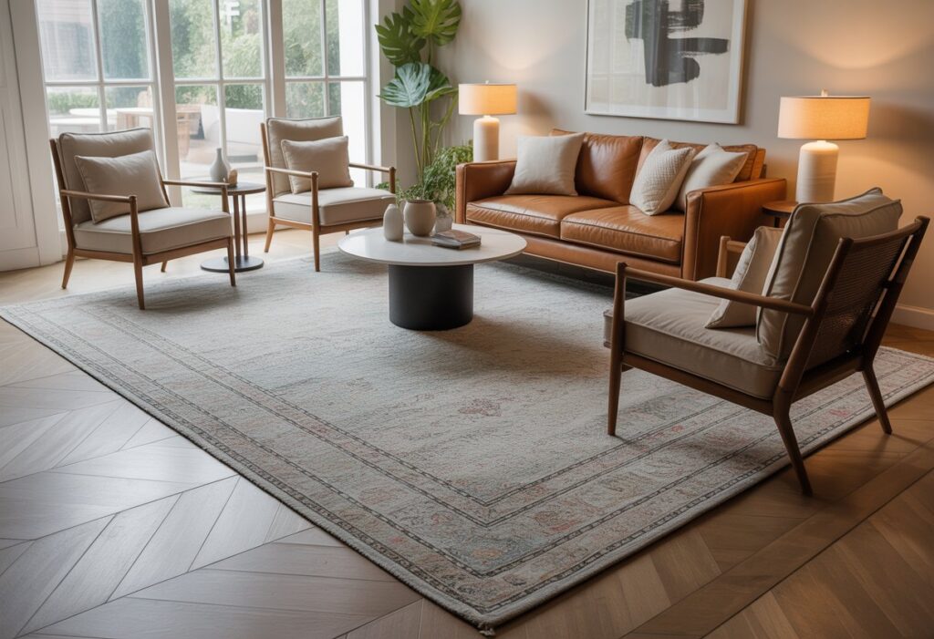 4) Add a large area rug to define the seating area