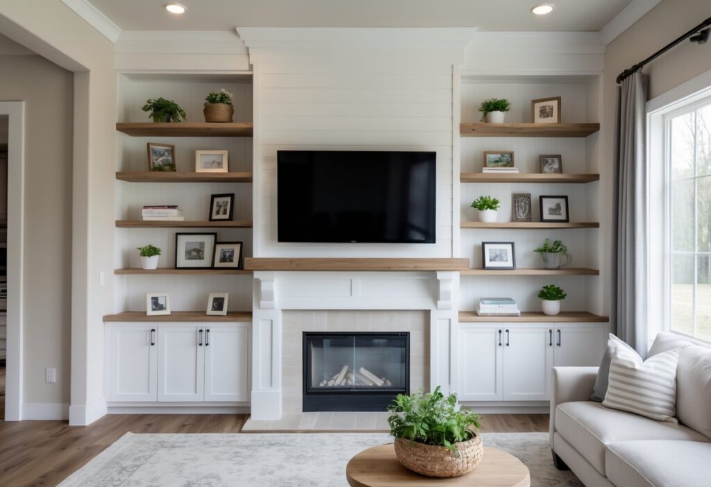 These shelves can be customized to fit different styles, from modern to farmhouse. They offer open spaces to display books, photos, and decor, as well as closed cabinets to hide clutter. This balance helps keep the room tidy and visually appealing.