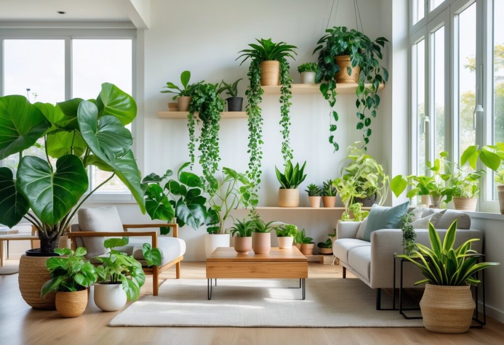 Trailing plants like ivy or string of pearls can hang to fill empty corners and add movement. Larger plants can serve as focal points, while smaller ones work well on shelves or tables.