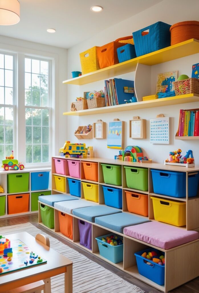 Multi-functional storage helps save space and keeps the playroom neat. Furniture like benches with hidden compartments or ottomans that double as seats add extra storage without clutter.