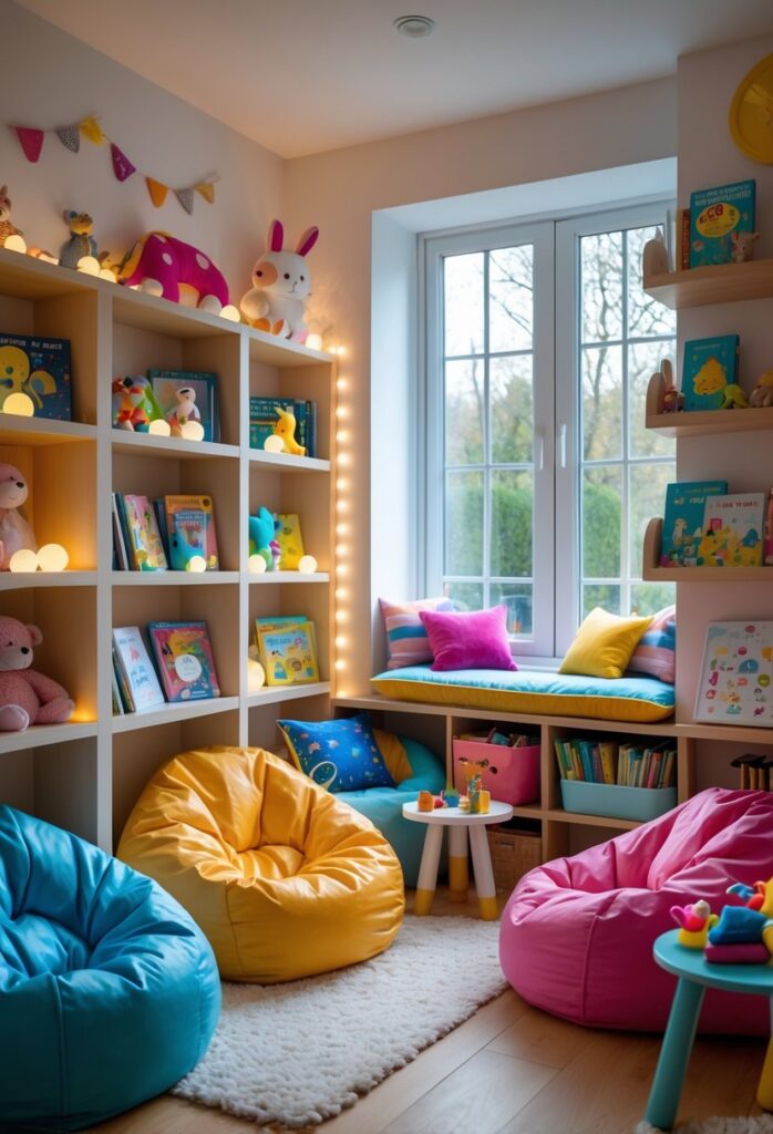 A cozy reading nook in a playroom offers a quiet space for kids to relax. Plush seating like bean bags or soft chairs makes the area inviting and comfortable.